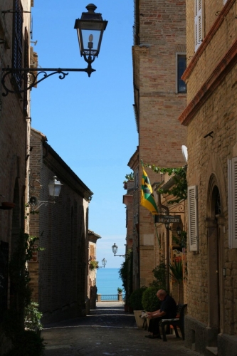 Torre di Palme è un fiero castello medievale munito di un saldo sistema difensivo, abbarbicato su uno sperone roccioso verso la distesa marina. Borgo prediletto di una scelta colonia di villeggianti che ne sanno apprezzare il fascino, Torre di Palme propone scorci urbani incomparabili; le anguste vie, strette tra le facciate in cotto delle case fiorite di geranei, inquadrano ampie vedute del mare e delle colline circostanti, basterà visitare le belle chiese medievali per reimmergersi in un’atmosfera di altri tempi. Lungo il corso, poco oltre l’antico palazzo priorale, si incontra quella gotica di S. Agostino che conserva un pregevole polittico di Vittore Crivelli. Una profusione di colori smaltati, vivificati dall’oro dei fondi, definisce le icastiche immagini dei Santi schierati su due ordini ai lati del trono sul quale siedono la Vergine col Bambino. La cornice originale in legno intagliato e dorato ancora unisce le varie tavole dipinte, formando un insieme coerente, spazialmente scandito secondo il ritmo disteso e pacato che ribadisce il tono malinconico dei volti. Proseguendo lungo il corso si giunge alla chiesa di Santa Maria a Mare, le cui strutture murarie recano i segni di varie modifiche subite nel corso dei secoli che non hanno del tutto cancellato l’impianto gotico del tempio. Splendenti bacini in maiolica risalenti al XIV secolo ne decorano la facciata e il campanile, mentre all’interno, sulla parete sinistra del presbiterio, ancora si ravvisa una gentile raffigurazione della Madonna di Loreto, affrescata da un ignoro pittore locale operante nell’orbita di Paolo da Visso. Usciti dalla chiesa, un ampio belvedere consente all’occhio di spaziare lungo le rive sabbiose di Porto San Giorgio, sino alla veduta del Monte Conero.