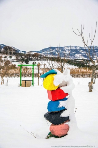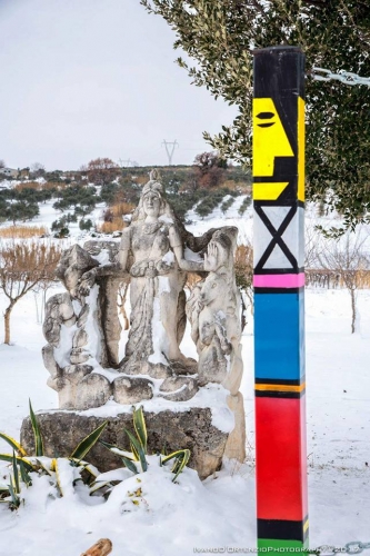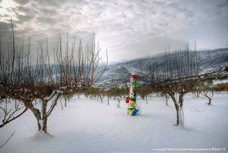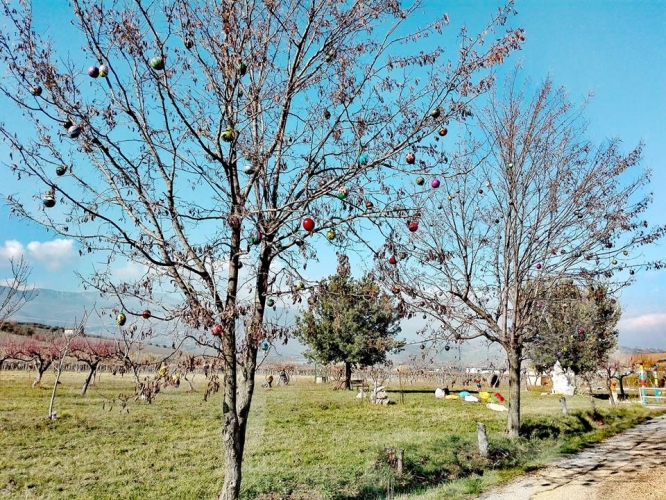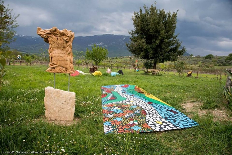 Contagiati da humus umanistico, culturale e religioso, in terra d’Abruzzo, precisamente in una suggestiva località di Tocco Casauria (PE) contrada Ceppette, ai piedi del Morrone, territorio santificato dalla presenza di Celestino V, un’artista e architetto di nome Edit, acronimo di Ergilia Di Teodoro ed lo scultore Arcangelo Carbone hanno ideato un progetto denominato “Campo dei melograni”. Si tratta in pratica di un’operazione culturale e turistica posta in essere allo scopo di tessere l’apologia di questo splendido albero con una consistente piantumazione di esso in una tenuta di oltre 6000 mq di terreno, autentico landscape che racchiude in sé tutta una filosofia di vita fondata sul benessere fisico e psichico favorito da quello che comunemente viene definito “panismo”, inteso come rapporto empatico con la natura. Il paesaggio campestre è arricchito di sculture e installazioni dei due artisti suindicati che nel tempo vedrà il contributo di altri insigni operatori operanti soprattutto nel campo della Land Art molto apprezzata nel comprensorio pescarese.